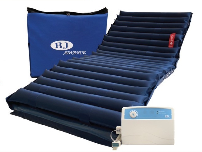 BJ Advacne รุ่นลอน เป็นที่นอนลมกันแผลกดทับ รุ่นลอน แบบ 2 จังหวะ ประกอบด้วยลูกลมวางเรียงติดต่อกันเป็นแถวตามขวาง โดยมีเครื่องควบคุมความดันลูกลมเป็นจังหวะสลับต่อเนื่องโดยที่ลูกลมจะพอง ขึ้น ขณะที่อีกลูกจะยุบตัวลง ทำให้ที่นอนมีการเคลื่อนไหวต่อเนื่อง เพื่อลดแรงกดทับบริเวณผิวสัมผัสระหว่างผู้ป่วยกับที่นอน ช่วยลดการเกิดแผลกดทับซึ่งเกิดจากน้ำหนักตัวของผู้ป่วยที่ไปกดบนที่นอนนานๆ ทำให้เซลล์ของเนื้อบริเวณที่ถูกกดทับตาย เกิดอาการเน่าขึ้น และแผลรักษาหายได้ยาก เหมาะกับผู้ป่วยที่เป็นอัมพาตหรือช่วยตัวเองไม่ได้